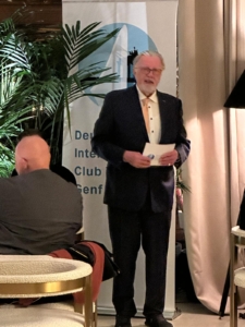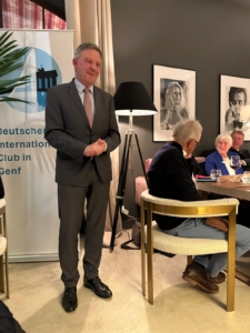 Der Präsident des Clubs, Ralph Tatu, begrüßte unter den Anwesenden den Botschafter der Bundesrepublik Deutschland in der Schweiz, S. E. Markus Potzel, sowie den Honorarkonsul für die Kantone Genf, Waadt und Wallis, Mathis Kern. Ebenfalls vertreten waren die Vorsitzende des Deutschen Hilfsvereins Genf, Helga Schmal, und der Präsident der Deutschen Gesellschaft für Kunst und Literatur, Armin Westerhoff. In seiner Ansprache betonte Tatu die Bedeutung von Zusammenhalt und Gemeinschaft – Werte, die heute wichtiger denn je seien.